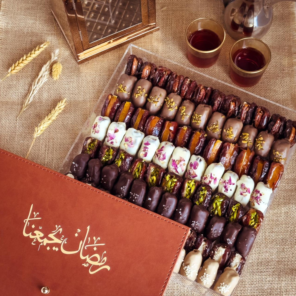 An assortment of handpicked dates, featuring rich, chocolate-coated delights and indulgent stuffed dates with a variety of nuts. Beautifully presented in an elegant acrylic box, this thoughtful gift is perfect for celebrating Ramadan with family and friends. The perfect blend of sweetness and luxury, offering a delicious treat wrapped in festive elegance.
