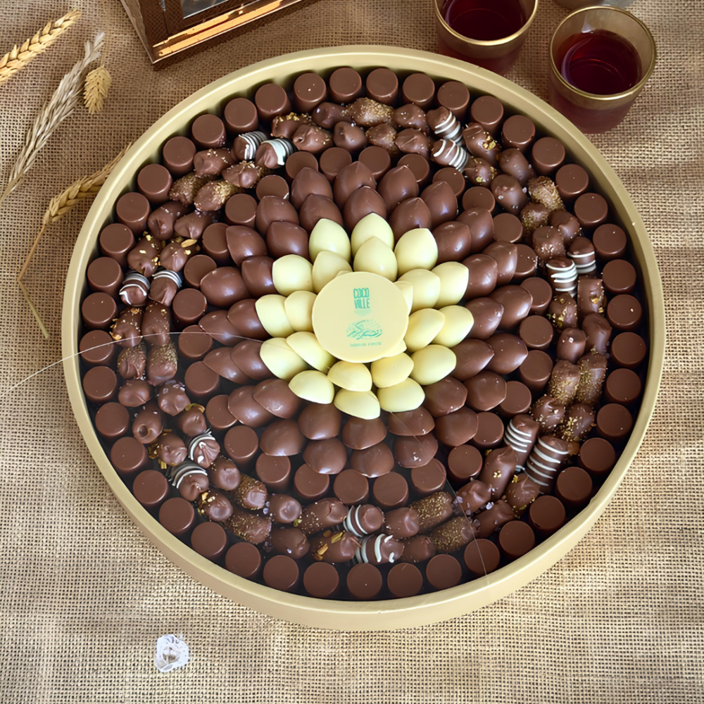 This creation features beautifully crafted chocolates and mini chocolate flutes wafer designed to resemble delicate flowers, elegantly arranged to create a visual feast that delights the senses.