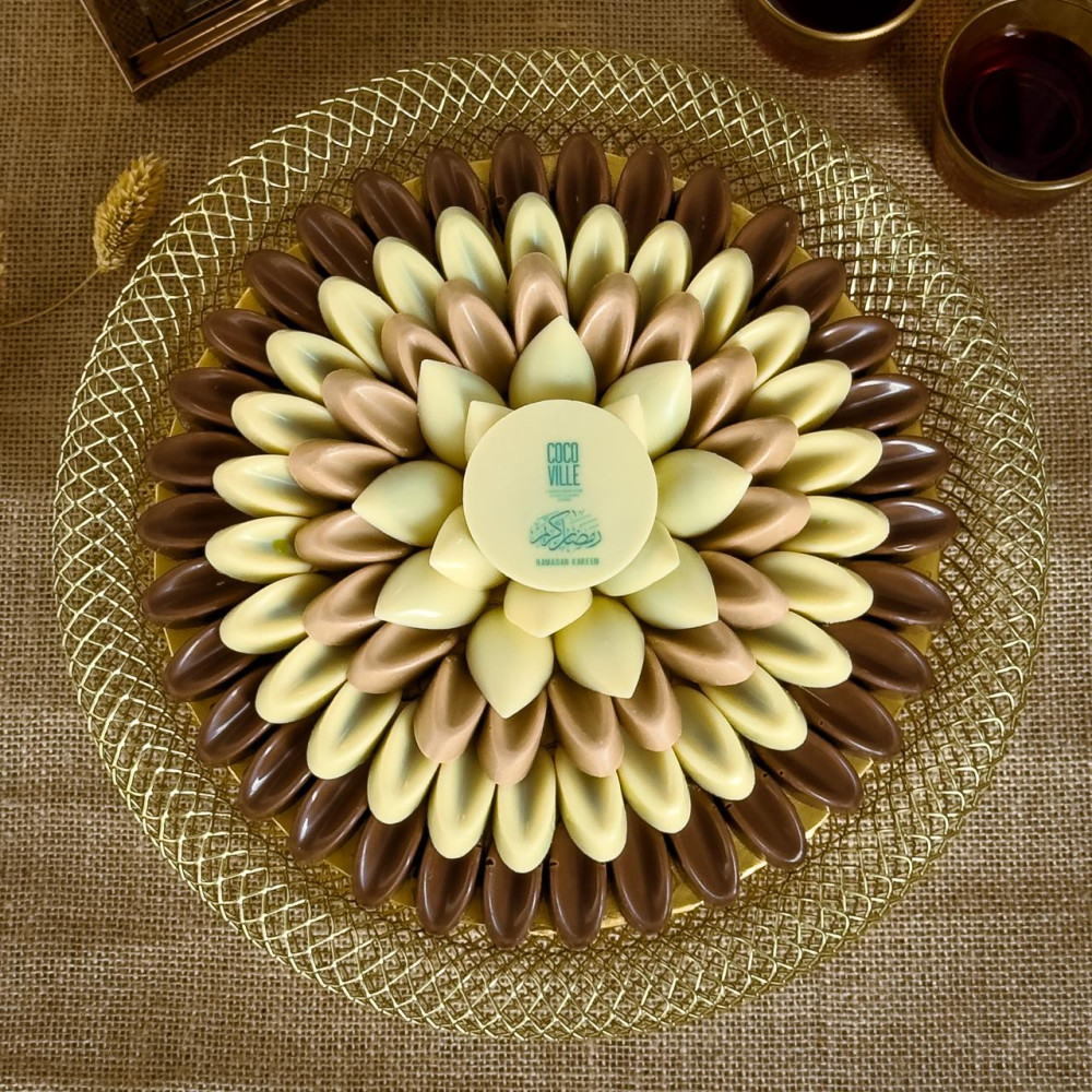 An elegant Ramadan creation where milk and white dulce chocolates bloom into delicate petal shapes, forming a floral symphony of sweetness, an ode to beauty, reflection, and the gentle joy of the holy month.