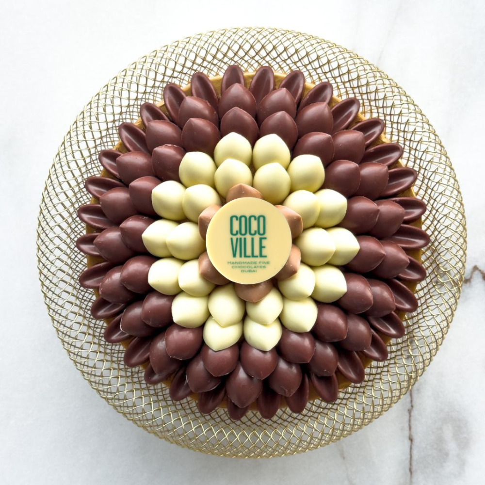 An elegant creation where milk, white and dulce chocolates bloom into delicate floral symphony of sweetness, an ode to beauty, reflection, and the gentle joy.