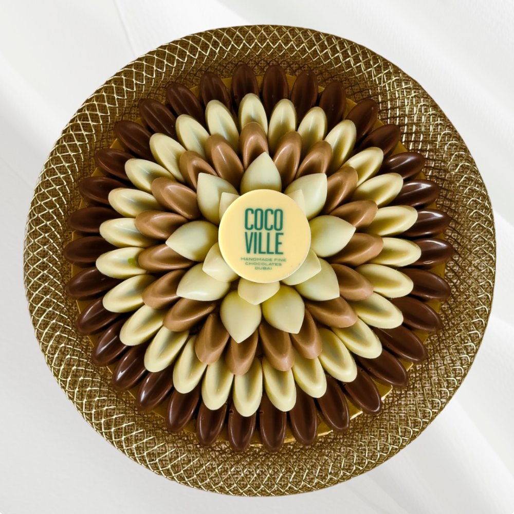 An elegant creation where milk, white and dulce chocolates bloom into delicate floral symphony of sweetness, an ode to beauty, reflection, and the gentle joy.